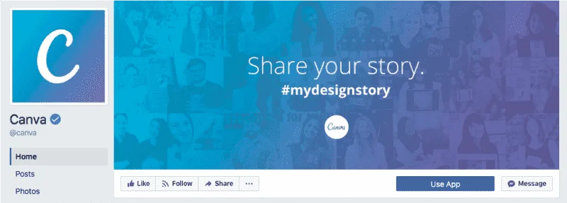 La prima è uno strumento di progettazione grafica che utilizza la sua immagine di copertina per incoraggiare gli utenti a pubblicare con il loro hashtag. Combina colori complementari, design elegante, e un brand chiaro. Il testo della call-to-action attira l’attenzione dei visitatori, ma non sopraffa con troppe informazioni.