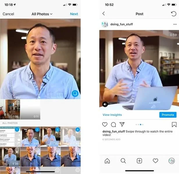 Per caricare un video lungo sul tuo feed Instagram, puoi farlo unendo più clip in un unico post: