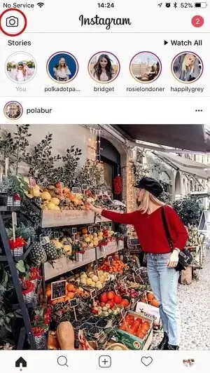 - Apri la fotocamera situata nell’angolo in alto a sinistra del tuo feed.