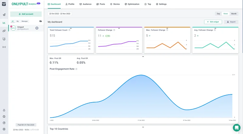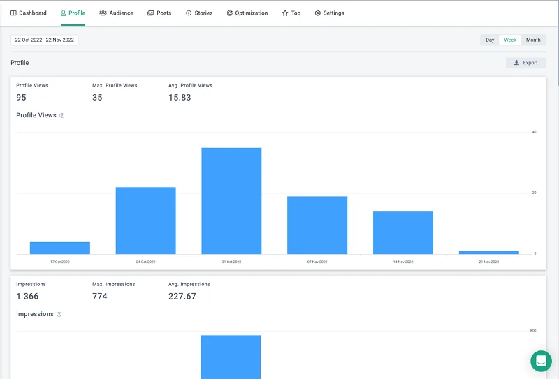 - Grafici personalizzati. È possibile selezionare i parametri per la raccolta delle statistiche nelle sezioni Profilo, Pubblico, Post, Storie e Ottimizzazione e ottenere il quadro completo sulla dashboard. Le informazioni dettagliate sono contenute nelle sezioni. È possibile trascinare i grafici e disporli in un ordine conveniente.