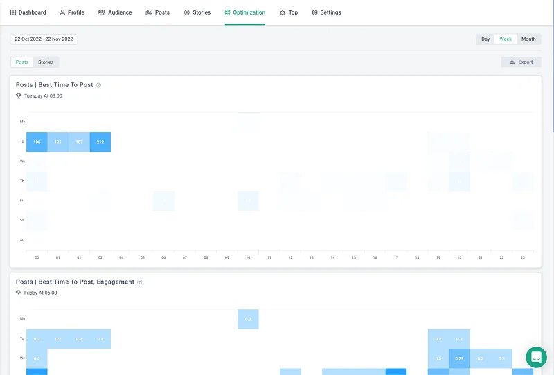 Ottimizzazione. In questa sezione è possibile vedere il momento migliore per postare, la frequenza delle pubblicazioni, la densità per giorno e ora, gli hashtag principali e molto altro ancora.