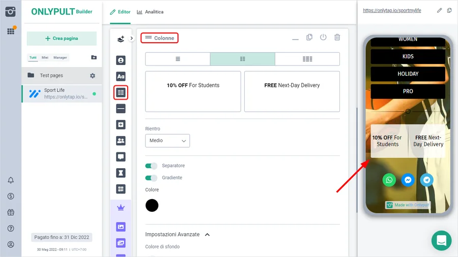 - Impostate la vista divisore di colonne e il colore di sfondo dell’intero blocco.