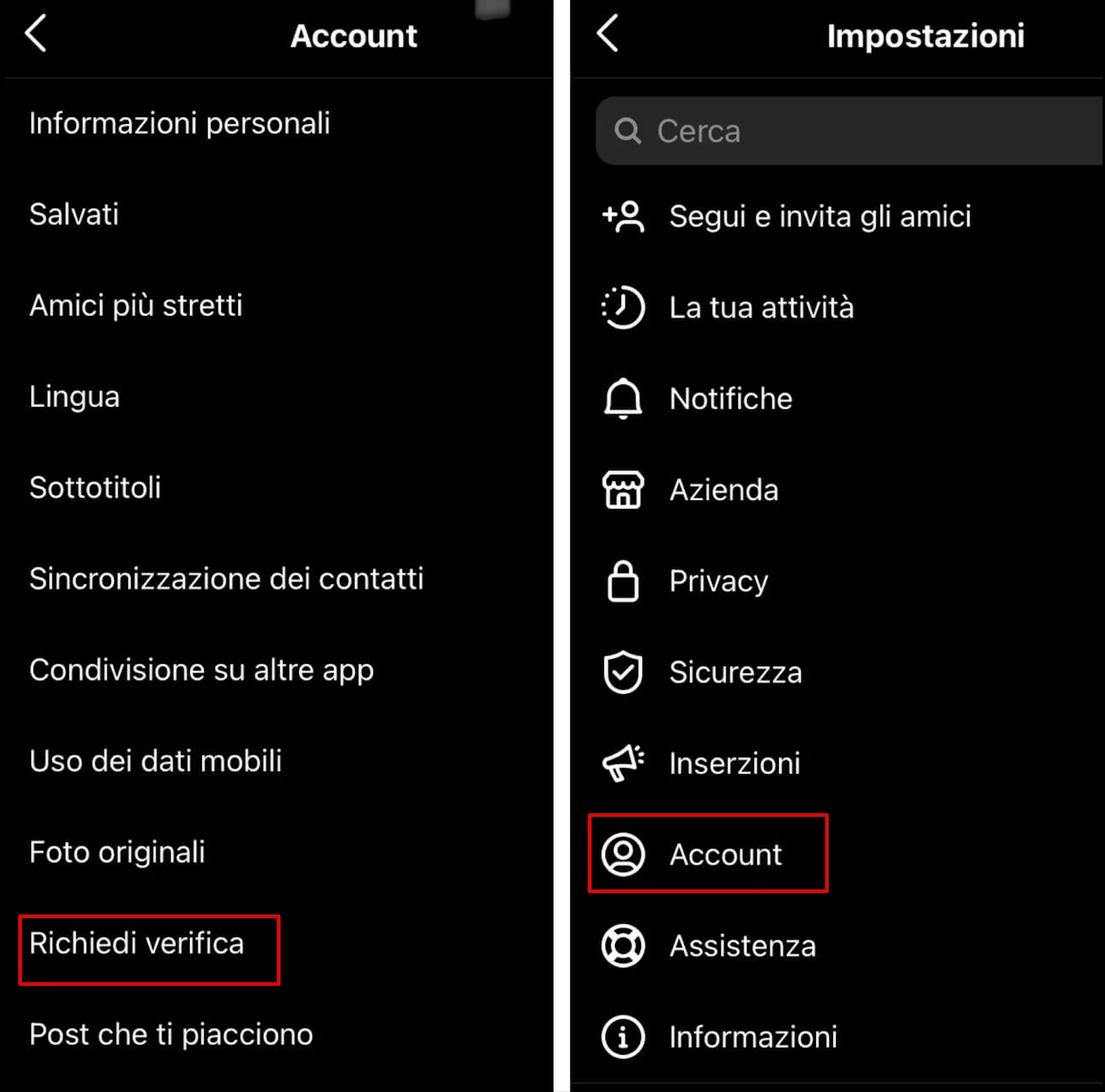 - Aprire “Impostazioni”, quindi “Account” e selezionare “Richiedi verifica”.
