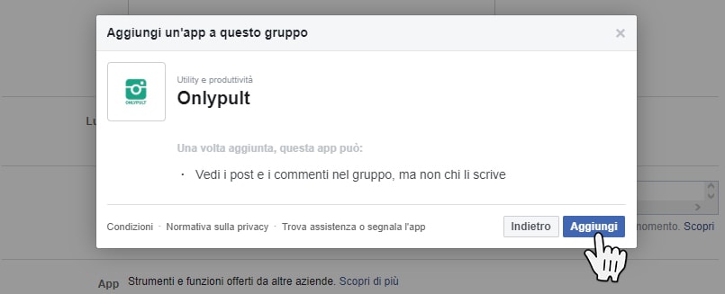- Specificare la nostra app nelle impostazioni del gruppo Facebook