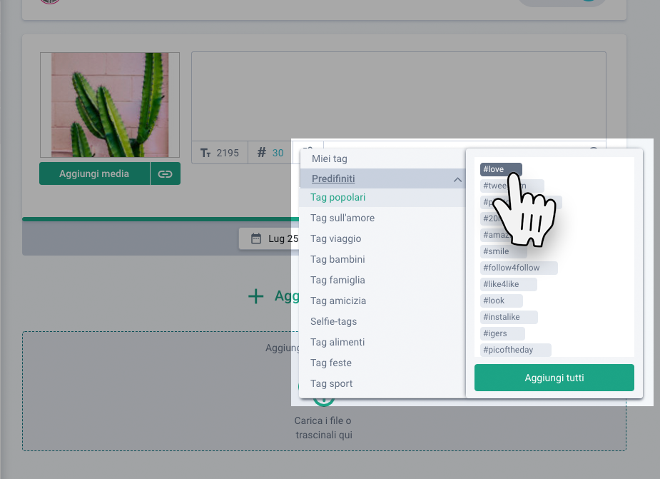 Abbiamo trovato per te gli hashtag più popolari e li abbiamo aggiunti in una sezione separata per permetterti di aggiungerli ai tuoi post velocemente.