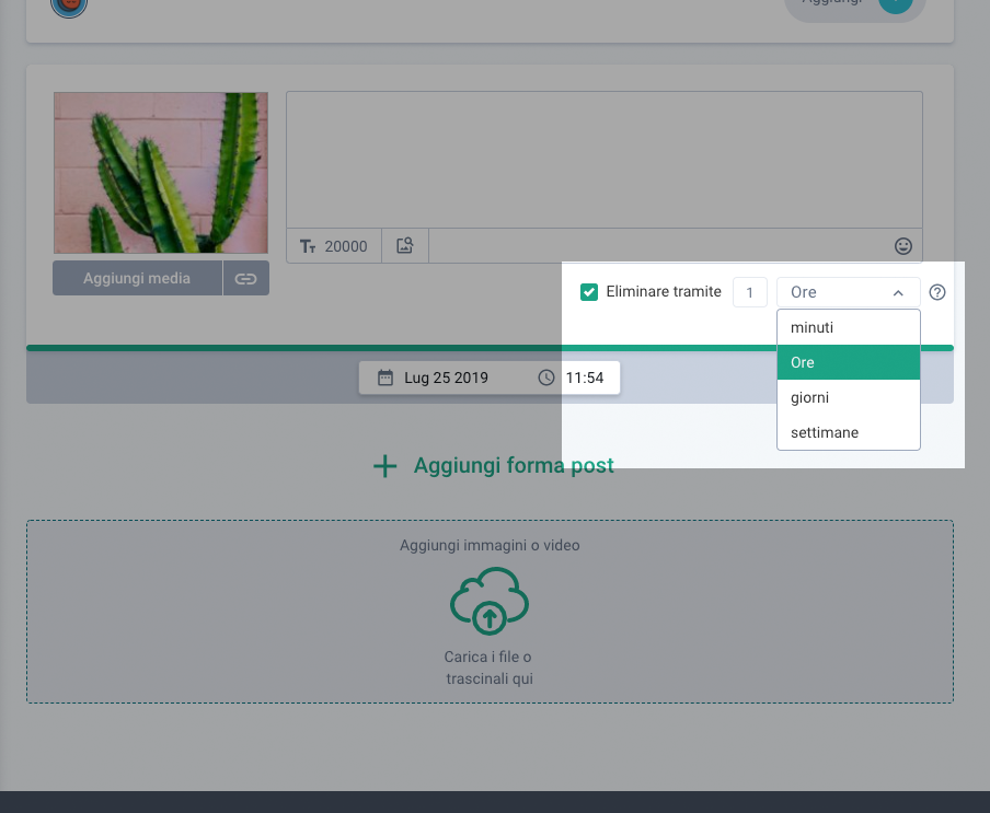 Quando crei un post, puoi anche impostare il tempo dopo il quale sarà automaticamente cancellato dal feed. Questa opzione può essere utile per un post pubblicitario o come parte di una campagna a breve termine.