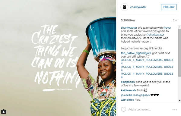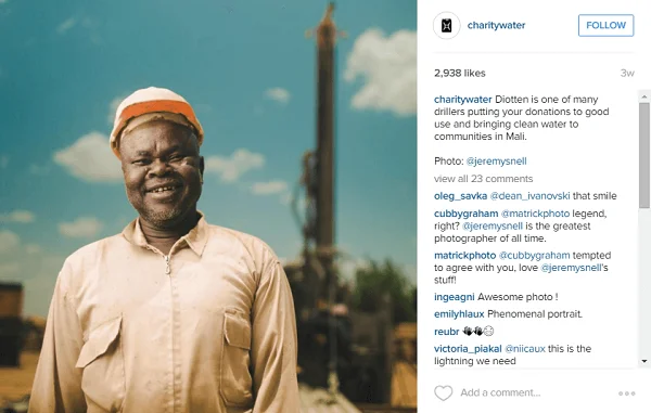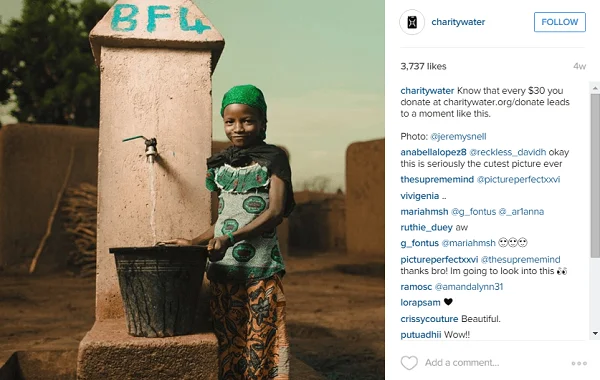 Em destaque está Instagram account of a social organization «Charity:water». Isto é uma organização de caridade não Governamental empenhada em fornecer água potável a pessoas em países subdesenvolvidos.