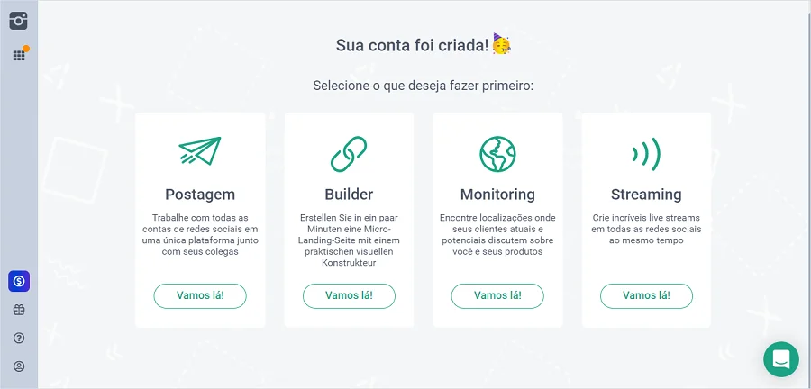 Depois de se inscrever no Onlypult, nossos novos usuários são redirecionados para a tela de boas-vindas. Lá eles podem visualizar os recursos da plataforma e selecionar o produto que precisarem: