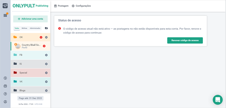 Se o código de acesso do seu perfil social OK for perdido ou expirar, o Onlypult lhe informará sobre isso quando você tentar agendar um post. Você precisa clicar em apenas um botão para renovar o código de acesso e continuar publicando: