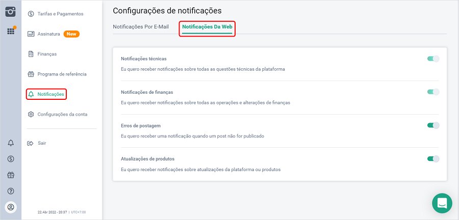 Você pode ativar/desativar o recebimento de notificações de diferentes tipos nas configurações da sua conta: