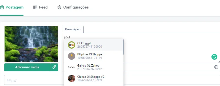 Agora você pode adicionar páginas e usuários a um post no Facebook diretamente do Onlypult. Comece a digitar o nome da página e selecione a desejada no menu pop-up.