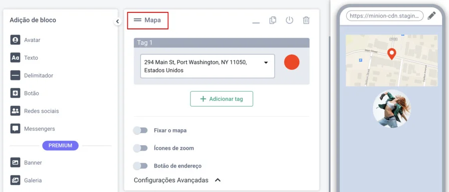 Agora você pode adicionar um mapa à sua página no Builder e fixar até 10 tags com endereços. A função está disponível apenas para tarifas de pedágio.