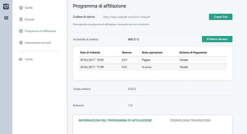 Todas informações sobre o programa de referência está disponível na seção especial. Aqui você pode achar os termos e condições do programa, todas operações, o seu número de referrals e o dinheiro disponível para saque.