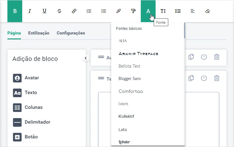 - Adicionamos muitas fontes* novas para o texto da sua página. Além disso, você pode adicionar até 10 fontes por conta própria:
