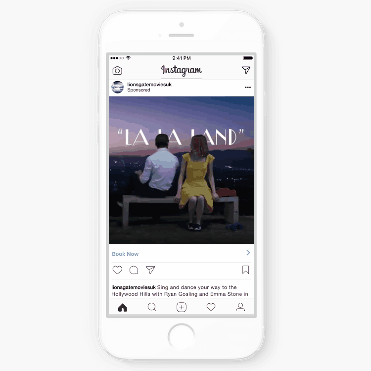 A publicidade por vídeo nas Histórias e no feed ajuda a marca a aumentar consideravelmente o seu reconhecimento (por exemplo, o filme La La Land).