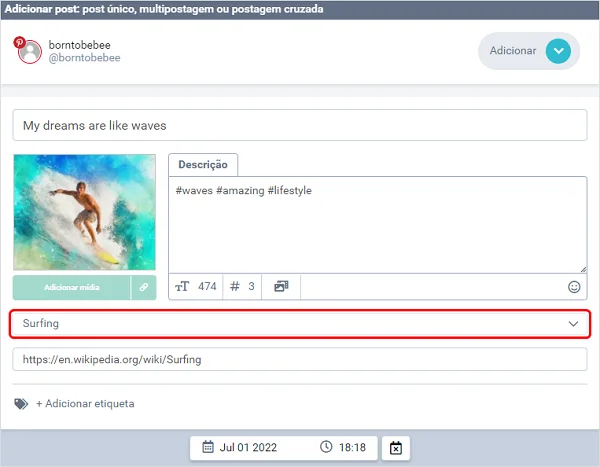 O pin será publicado no painel que você definiu como padrão nas configurações de sua conta do Pinterest (veja “Selecionando um board”).