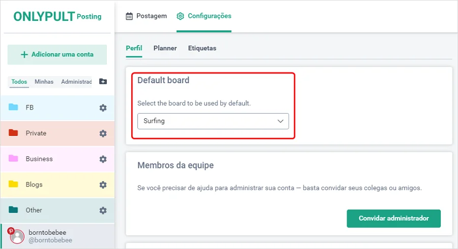 O board exibido aqui por padrão é aquele que você definiu nas configurações de sua conta do Pinterest: