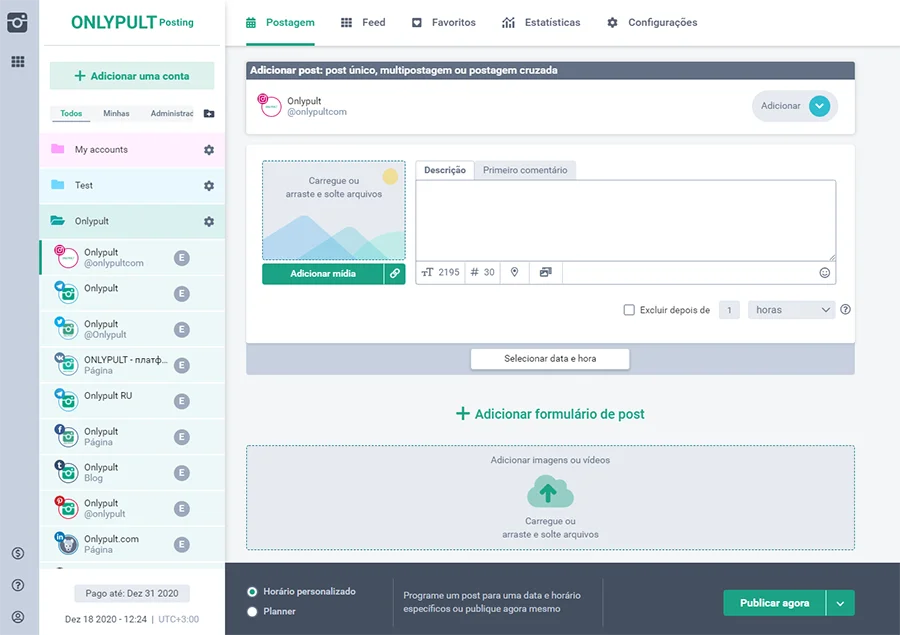 Onlypult Posting é um exemplo de ferramenta de automação usada para publicar e programar seu conteúdo do Instagram. Existem opções para carregar arquivos como posts normais ou de carrossel. Você só precisará seguir algumas etapas: