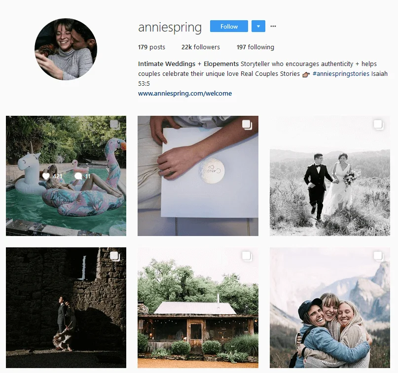 Entretanto, há aqueles que adotam uma tática reversa e raramente, muito raramente, publicam novos posts. Por exemplo, existe o caso da estilista de casamentos AnnieSpring, Annie Spring @anniespring, que publica conteúdo uma vez a cada duas semanas ou até mesmo a cada mês, porém isso não a impede de ter sucesso.