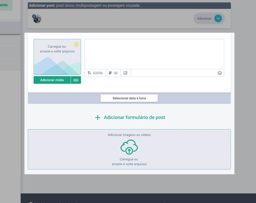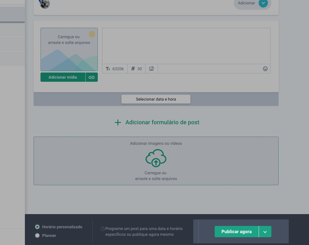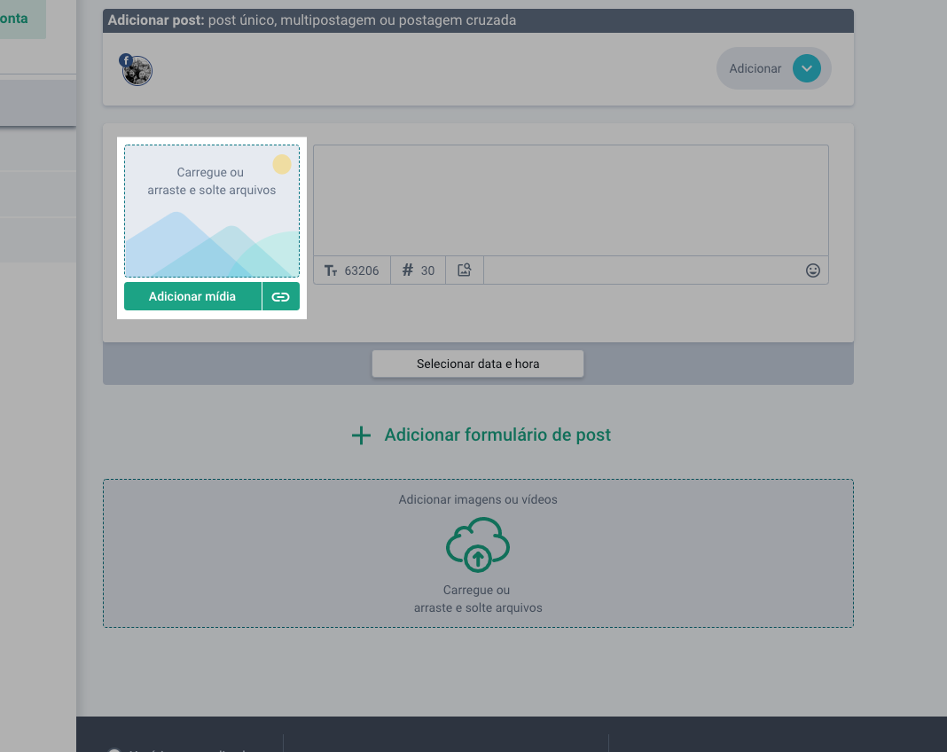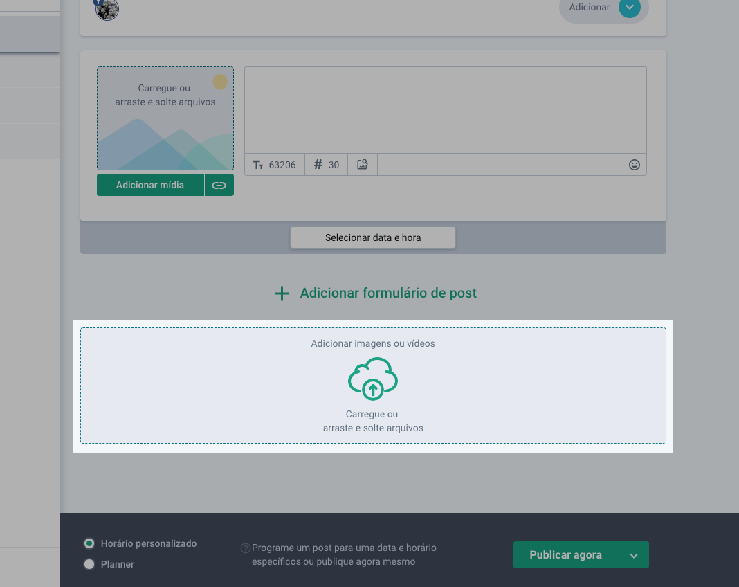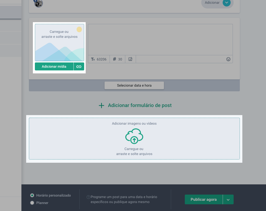 Para adicionar uma foto ou um vídeo, você pode tanto pressionar Adicionar mídia quanto arrastar arquivos para o campo pontilhado.