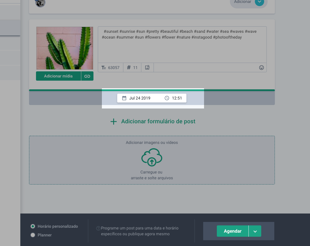 Se você quiser agendar um post para um horário específico, selecione uma data e um horário e pressione Agendar.