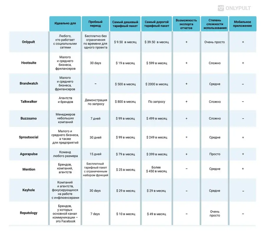 Мы рассмотрели все наиболее важные аспекты каждого сервиса, теперь можно сделать сравнительный анализ. В таблице ниже изложена наша оценка по топовым инструментам мониторинга социальных сетей.