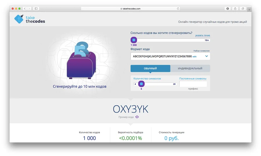 Многофункциональный онлайн-генератор случайных кодов для рекламных кампаний и промо-акций. Позволяет создавать от 1000 до 10 млн кодов онлайн без регистрации.