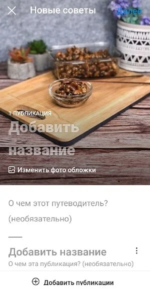 На следующем этапе вам нужно назвать эту подборку и добавить к ней обложку. Обложку можно выбрать либо из постов в вашем профиле, либо из тех, которые вы уже добавили в гайд. Также вы можете сделать название для каждой подборки и потом добавить небольшое описание к каждому посту.