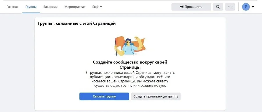 Для создания группы непосредственно на странице бренда, следует перейти в аккаунт бренда. В центральном секторе найти вкладку Группы и кликнуть кнопку «Создать связанную группу».