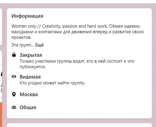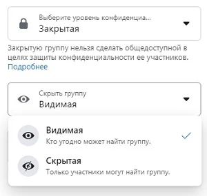 Приватные группы, в свою очередь, делятся на видимые и скрытые. Видимые приватные группы отображаются в результатах поиска, данные об администраторе видны всем пользователям Facebook. Скрытая приватная группа не отображается в результатах поиска, и для того, чтобы попасть на страницу, необходимо получить персональное приглашение от другого участника сообщества.