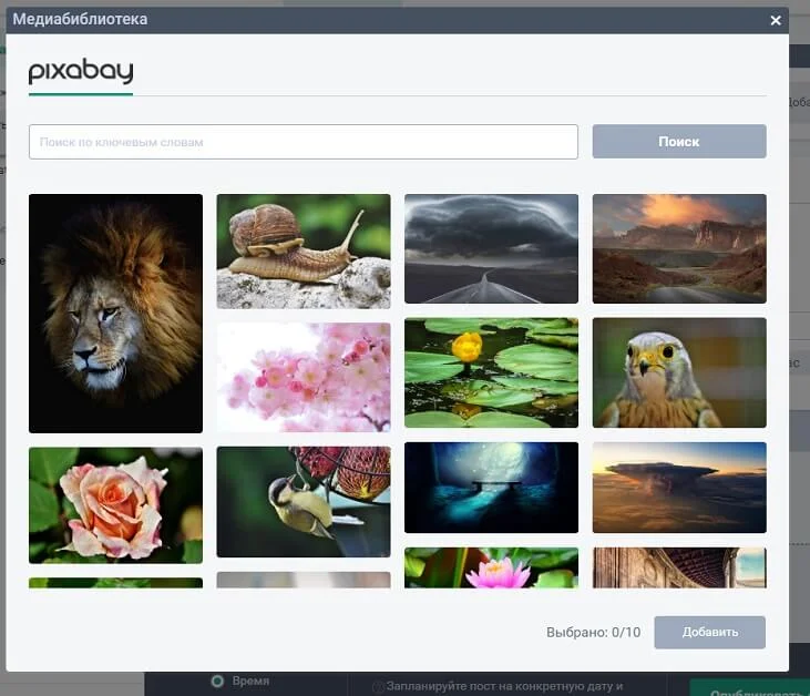 На сайте Onlypult.com теперь есть возможность поиска фотографий по лицензии Royalty-free. Поиск осуществляется на фотостоке Pixabay. Это можно делать через форму редактирования поста. Нажмите кнопку «Добавить медиа» и ищите нужное вам фото или другое изображение.