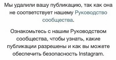 К более очевидным причинам блокировки относятся незаконные публикации и контент, который запрещен правилами Инстаграм. Например, фото обнаженных детей, продажа оружия, порнография, пропаганда суицида и самоповреждающего поведения (фото порезов, окровавленных рук, лица и т. д.) Полный список «запрещенки» есть в Руководстве сообщества.