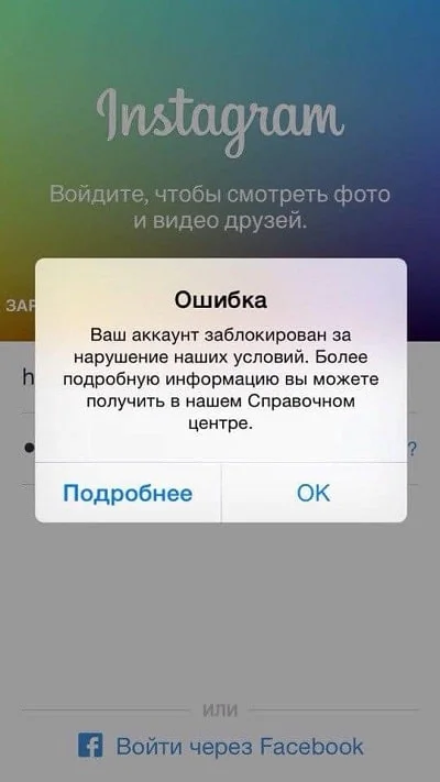 Такой вид блокировки применяется за конкретные грубые нарушения правил Инстаграм или за массу мелких проступков. При входе в аккаунт вы увидите сообщение о блокировке и кнопку «подробнее».