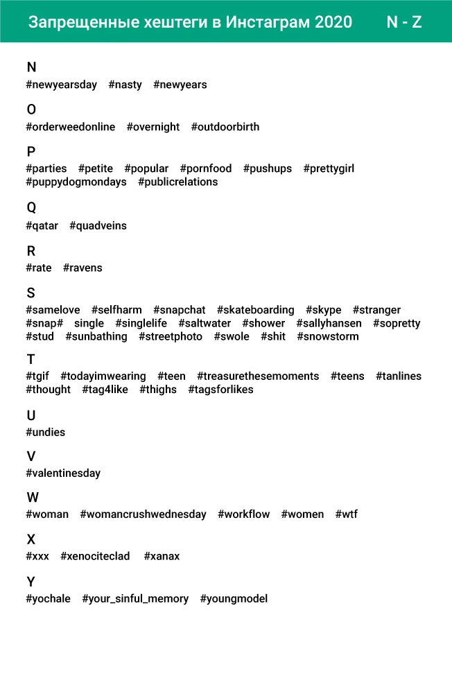 Инстаграм стимулирует сообщество пользоваться более редкими и подходящими к конкретной публикации хэштегами, чтобы исключить нерелевантный контент и облегчить поиск. Наказание можно получить за использование слишком популярных хэштегов, например, #love, #Moscow, #beauty. Также существует список запрещенных хештегов, среди которых есть вполне безобидные, например, #puppydogmonday.
