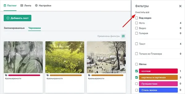 Прислушавшись к вашему мнению, мы доработали инструмент “Фильтры”. Теперь вы можете настроить фильтр, закрыть его меню, перейти в другой аккаунт и работать там, затем вернуться - и фильтр не изменится. Поставленные галочки не сбросятся до тех пор, пока вы сами их не уберете. Чтобы это сделать в один клик, используйте функцию “Очистить все”.