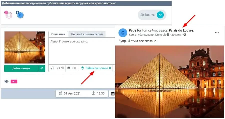 Также метка не потеряется и при дублировании Instagram-поста в Facebook.