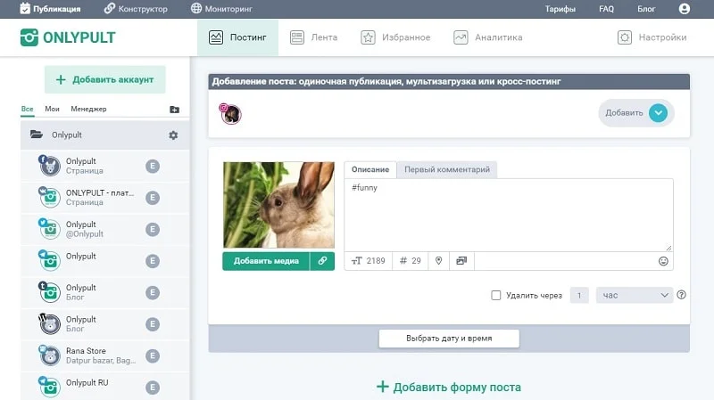 Onlypult – пример автоматизированного инструмента для постинга и планирования выхода контента в Инстаграм. В нем возможно оформлять как отдельные фотографии, так и «карусели». Все просто, на самом деле, стоит лишь только: