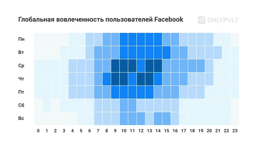 Онлайн компании, работающие в потребительском сегменте, показывают наилучшие результаты в будние дни, а именно со среды по пятницу. Как и на других платформах, пользователи Facebook* смотрят свою новостную ленту в перерывах на работе. Однако, есть пиковое время, в которое можно воспользоваться повышенным вниманием пользователей.