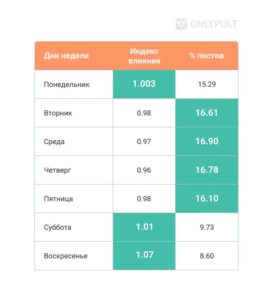 - Лучший день: среда;