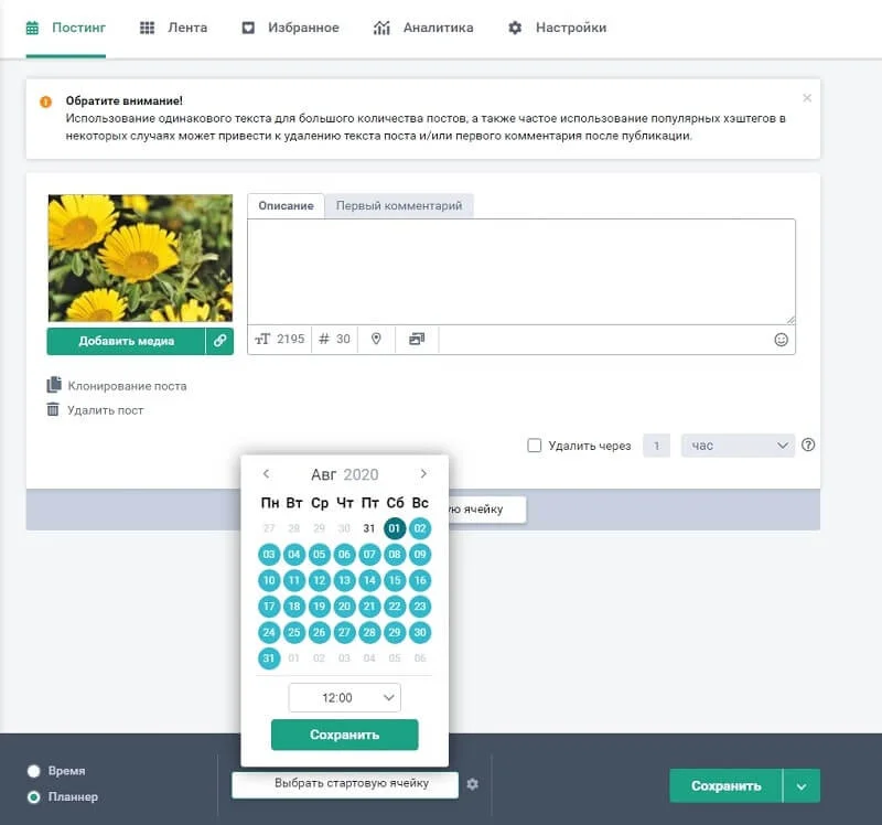 - Далее нажать «Выбрать дату и время» в нижней командной строке, откроются доступные дни и временные интервалы – выберите нужные для публикации контента.