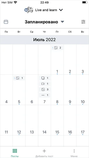 Синяя точка под числом означает, что для этой даты есть свободные ячейки в Планнере. Точка слева от иконки поста означает, что он занимает ячейку Планнера.