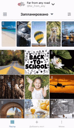 Выбрав вид “Плитка” в списке постов “Запланировано”, вы можете перетаскивать посты, меняя очередность их публикации: