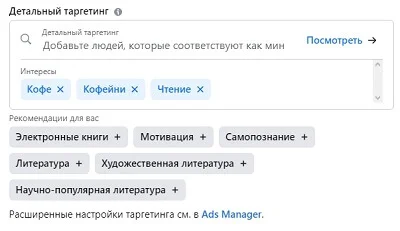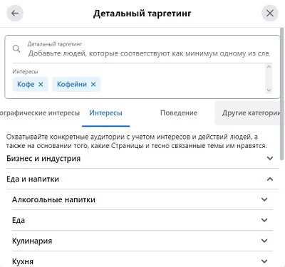 Есть второй способ. Например, мы хотим, чтобы несколько интересов обязательно были у одного и того же пользователя. Как это сделать? Нам нужна настройка по сужению аудитории. Убираем рестораны, кофейни, оставим здесь дополнительные интересы с напитками и чай, кофе.