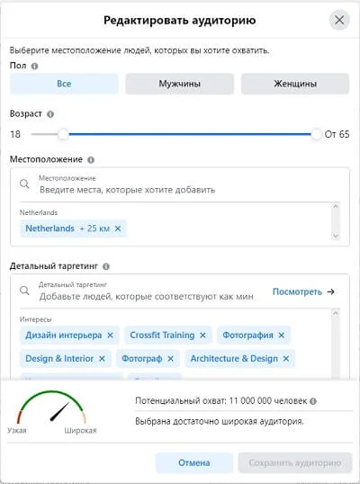 Мы добавили основные интересы и уже видим, что аудитория уменьшилась до 70 000 человек. Мы уже сейчас можем запустить это в рекламу.