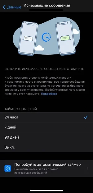 Включить и выключить опцию можно в любой момент в настройках конфиденциальности (пункт меню “Таймер сообщений”).