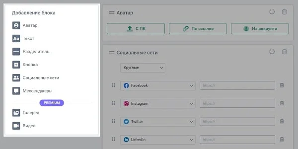 - блок “Мессенджеры”, где вы можете оставить свои контакты, чтобы клиенты связывались с вами там, где им удобно;