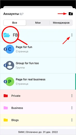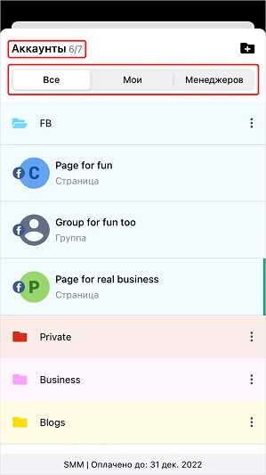 Свои собственные аккаунты и аккаунты, к которым у вас менеджерский доступ, вы можете фильтровать переключением вкладок вверху списка.