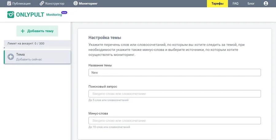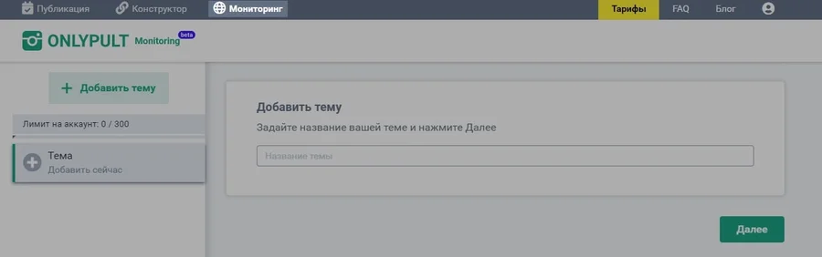 Любой тариф Onlypult Публикация дает возможность использовать Мониторинг с ограничениями тарифа FREE. Вы так же можете приобрести расширенный тариф Мониторинга, перейдя в раздел “Тарифы”. |