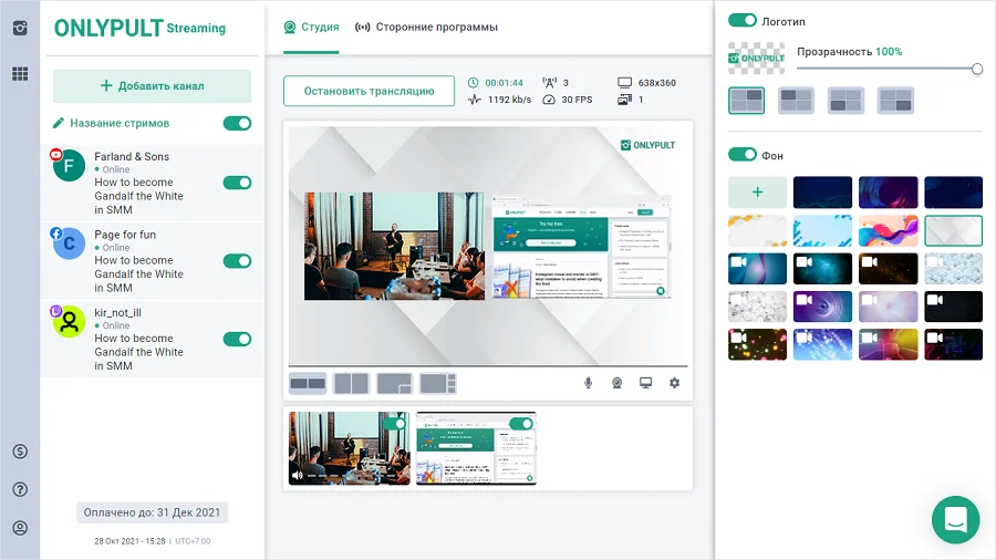Onlypult Стриминг - это простой в использовании инструмент для создания онлайн-трансляции сразу на нескольких каналах разных стриминговых платформ. Делитесь живым видео с вашими подписчиками на Facebook, YouTube, Twitch и других платформах одновременно!