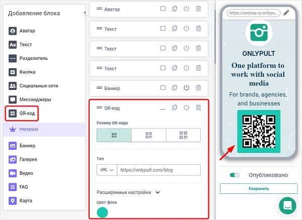 Используйте новый бесплатный блок для добавления QR-кода на свой мини-лендинг. Вы можете настроить:
